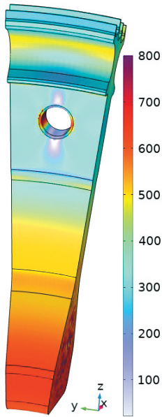 Рассчитывается распределение остаточных напряжений, порожденных собственными деформациями, а также напряжений, вызванных максимальными эксплуатационными нагрузками в полетном цикле (рис. 2). Остаточные напряжения смещают опасную точку с поверхности внутрь детали, практически не изменяя эксплуатационных напряжений. Для оценки времени зарождения усталостной трещины на полетных циклах используется предложенная авторами эволюционная модель.
