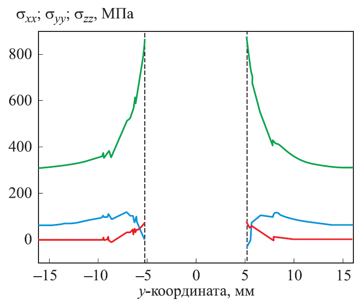 Рис. 2. ‑ Поля напряжений вблизи отверстия с учетом эксплуатационной нагрузки и технологических остаточных напряжений