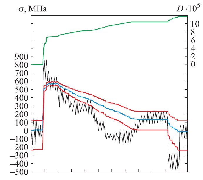 Расчет для различных представлений полетного цикла и различных распределений собственных деформаций вблизи поверхности (рис. 3) показал, что упрощение первого или второго приводит к менее консервативным (завышенным) оценкам усталостной долговечности.
