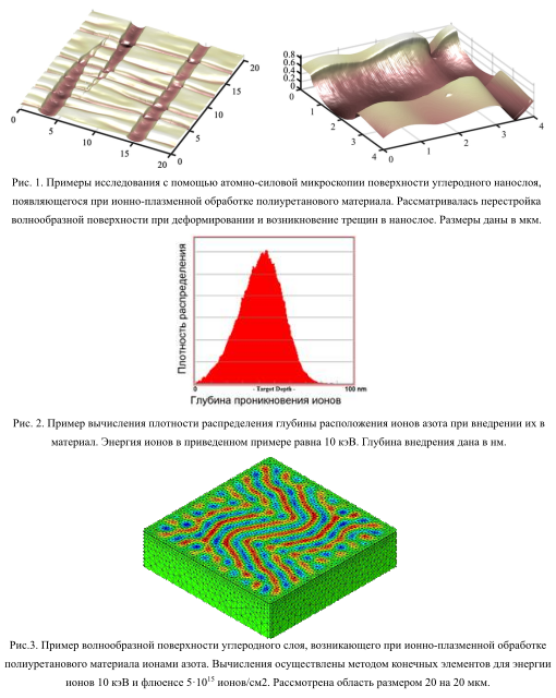 Предложена новая модель, объясняющая механизм появления волнообразной поверхности. Нанослой рассматривается как смесь двух континуумов. Это деформируемый континуум (углерод) и континуум, образованный электрическими зарядами (ионами азота). Электрические заряды стремятся удалиться друг от друга. Перераспределение зарядов вызывает появление напряжений в углероде, искривление нанослоя, формирование волнообразной поверхности. В натурных экспериментах и в компьютерном моделировании установлено, как технологические параметры влияют на особенности формирования углеродного нанослоя во время ионно-плазменной обработки. Управлять можно величиной флюенса (количеством ионов, проникших в полиуретан через единицу площади поверхности) и энергией ионов азота.