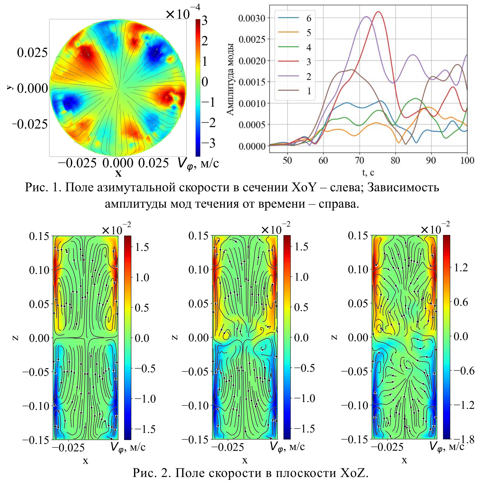 Переходной процесс, развития неустойчивости изучен для различных значений силового параметра. Возникающая неустойчивость Кельвина-Гельмгольца становится источником развития малых возмущений и приводит к турбулентному перемешиванию жидкости. Наибольший вклад в энергию возмущений вносят вторая и третья азимутальные моды.
