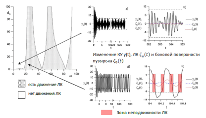Изучаются вынужденные осесимметричные колебания зажатого газового пузырька под действием осциллирующего поля давления. Применяются специфические граничные условия: скольжение контактной линии может реализоваться только при отклонении контактного угла, превышающем некоторое критическое значение. В результате может наблюдаться динамика прилипания-скольжения....