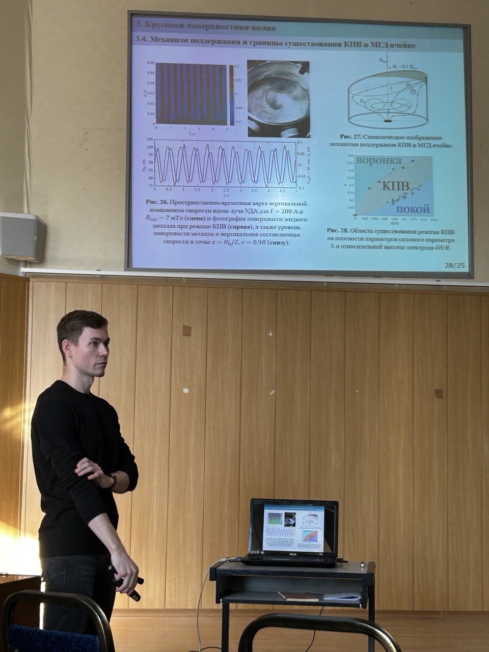 Поздравляем Владислава Андреевича Ельтищева с успешной защитой диссертации "Структура потоков и динамика поверхности при МГД течениях в цилиндрических объемах" на соискание ученой степени кандидата физико-математических наук по специальности 1.1.9 Механика жидкости, газа и плазмы.